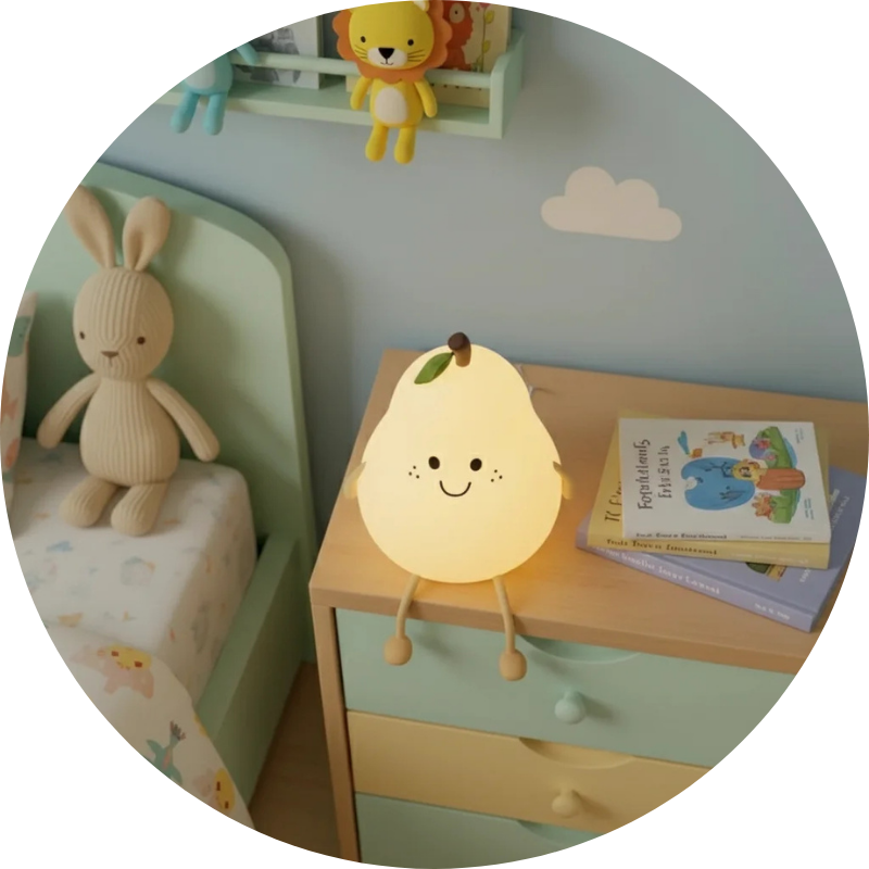 Avec son sourire et ses petites pattes, cette veilleuse poire est bien plus qu'une lampe : c'est un ami qui veillera sur les nuits de votre enfant.